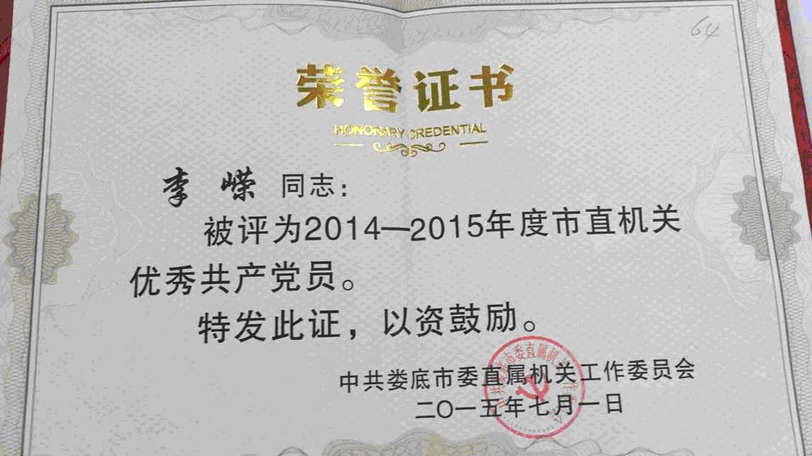 李嶸同志榮獲“婁底市2014-2015年度優(yōu)秀共產(chǎn)黨員”