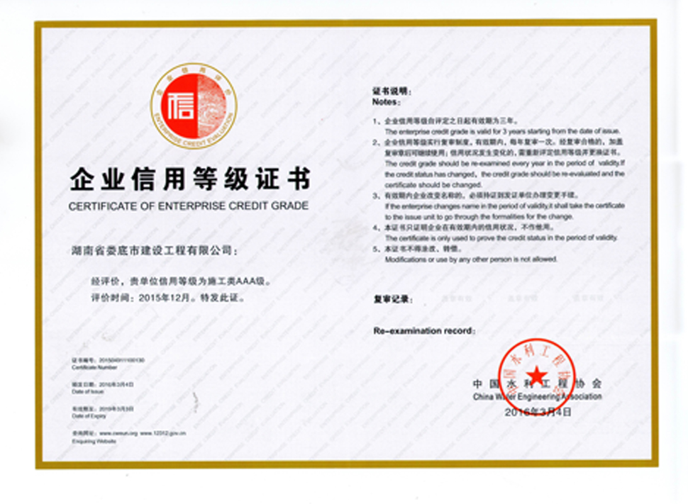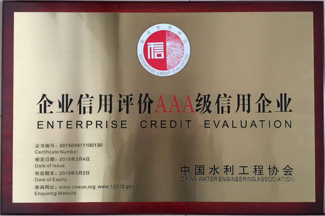 2016年3月公司榮獲中國水利工程協(xié)會評定的“企業(yè)信用評價AAA級信用企業(yè)”稱號