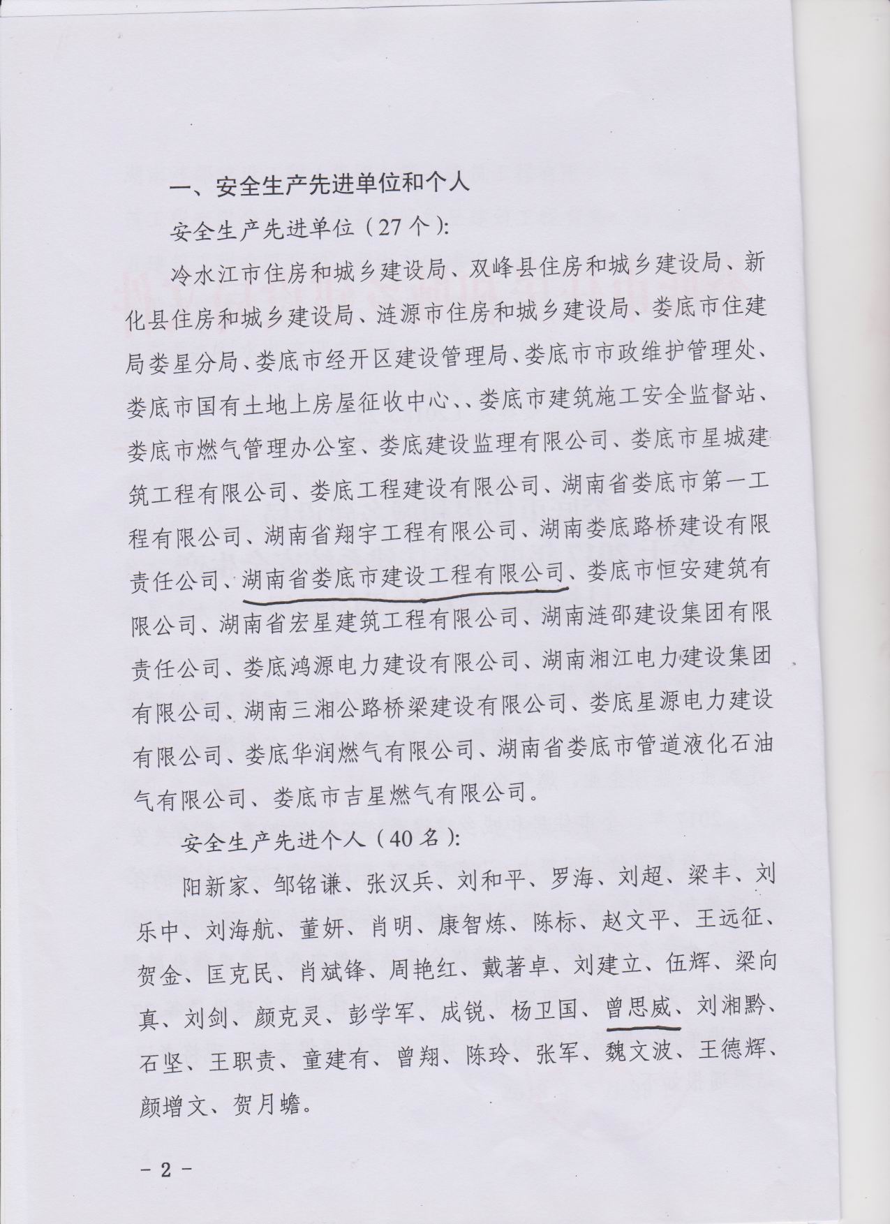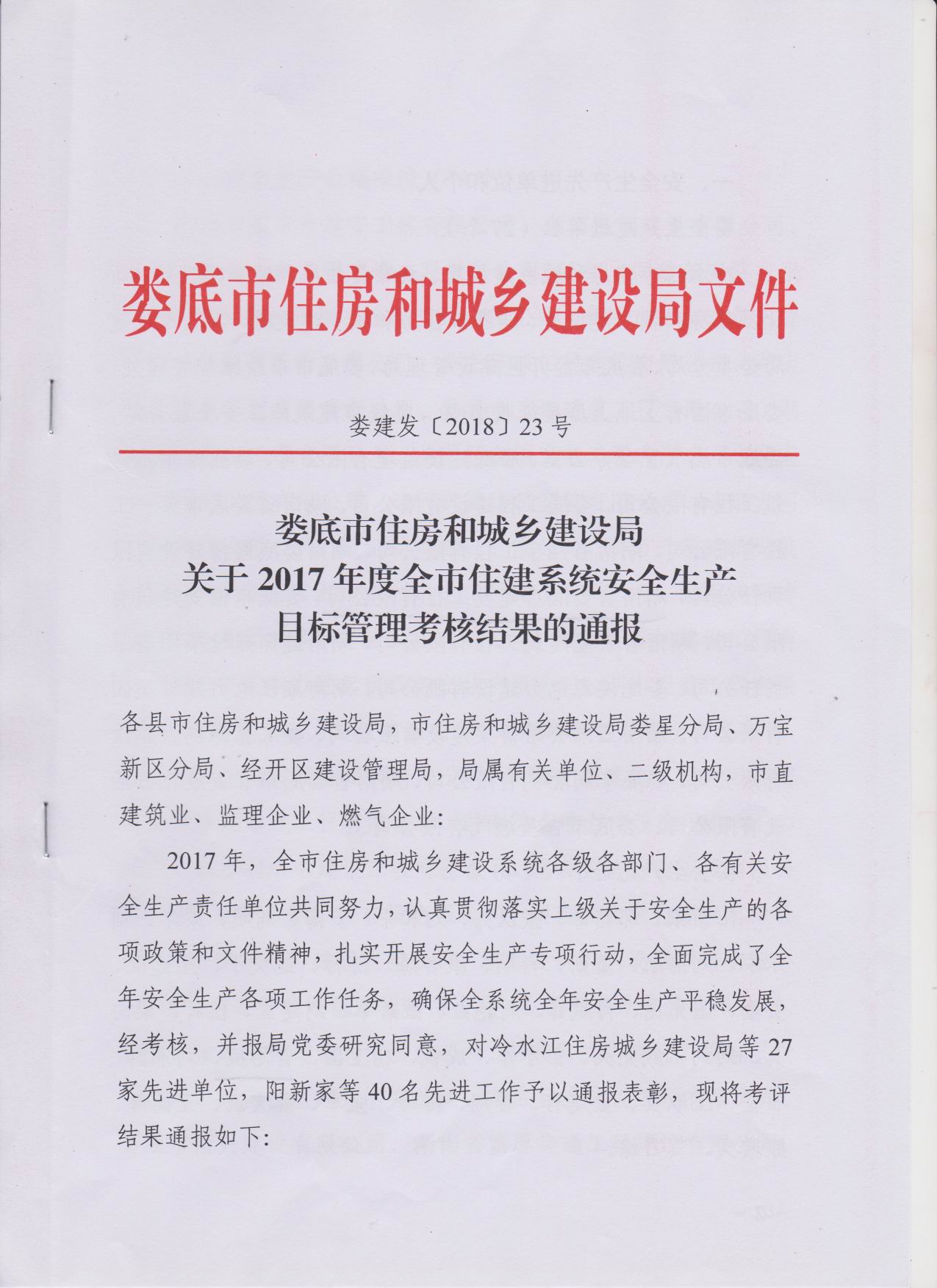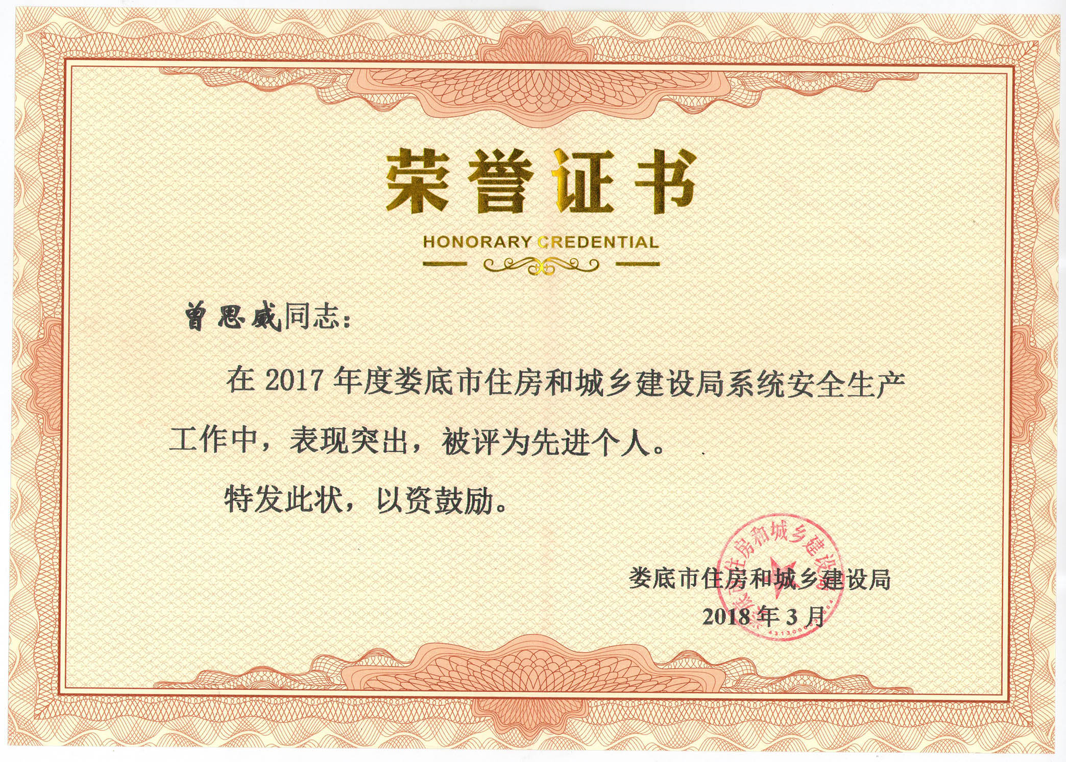 在2017年度婁底市住建系統(tǒng)安全生產(chǎn)目標(biāo)管理考核中,我公司被評(píng)為“先進(jìn)單位”,公司副總經(jīng)理曾思威同志被評(píng)為“先進(jìn)個(gè)人”。